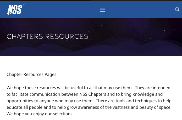 Chapter Resources Now on NSS Website Post author:Ed Kulis Post published:October 9, 2025 Post category:Cooperating Organizations / Featured / Uncategorized Post comments:0 Comments Here’s the new location of the chapter resources page which is now on the NSS Website And here’s the look of the top of the page. Click the image to go to the NSS page. You Might Also Like Virgin Galactic launches civilian tourists into space August 12, 2023 International Space Development Conference February 22, 2020 Amateur Solid Rocket Controlled Landing! September 7, 2024 Leave a Reply Cancel replyYou must be logged in to post a comment.
