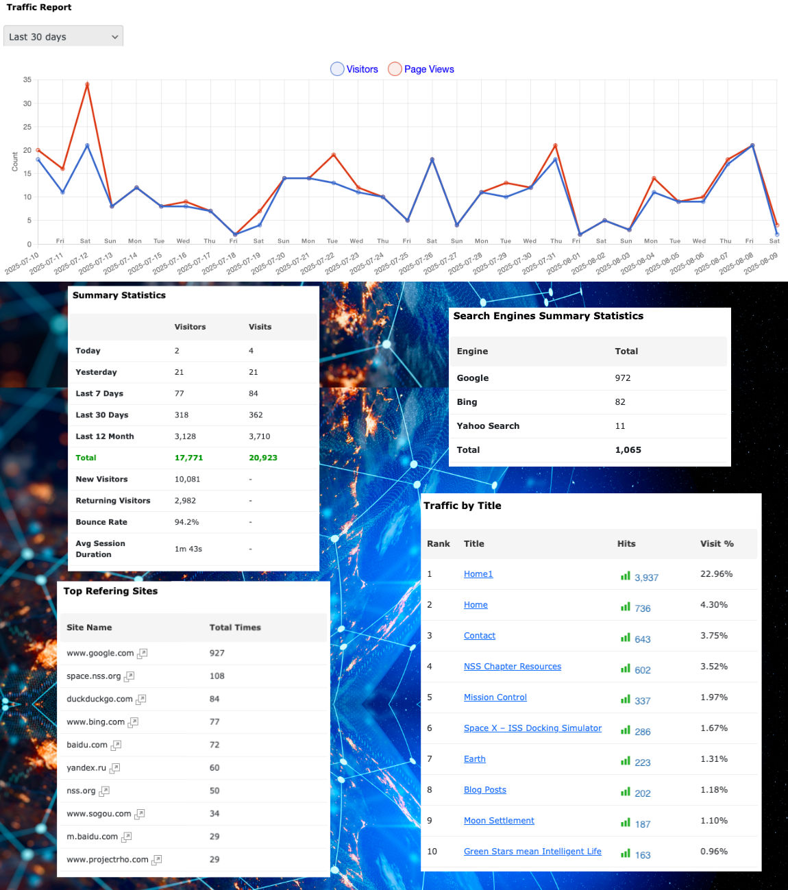 SacL5 Website Traffic Report 8/9/25 – Visits: 20,923 (+309) Post author:Ed Kulis Post published:August 9, 2025 Post category:Mission Control / Uncategorized Post comments:0 Comments SacL5 Web Site Traffic Report – Day 2,130318 visits last 30 days3,710 visits last 12 months 20,923 visits since Oct 10, 2019 2,011 You Might Also Like SacL5 Meeting 11/13/21 November 19, 2021 Posting to SacL5 with Elementor January 2, 2026 SacL5 Website Traffic Report 5/13/23 – Visits: 12,306 (+567) May 13, 2023 Leave a Reply Cancel replyYou must be logged in to post a comment.